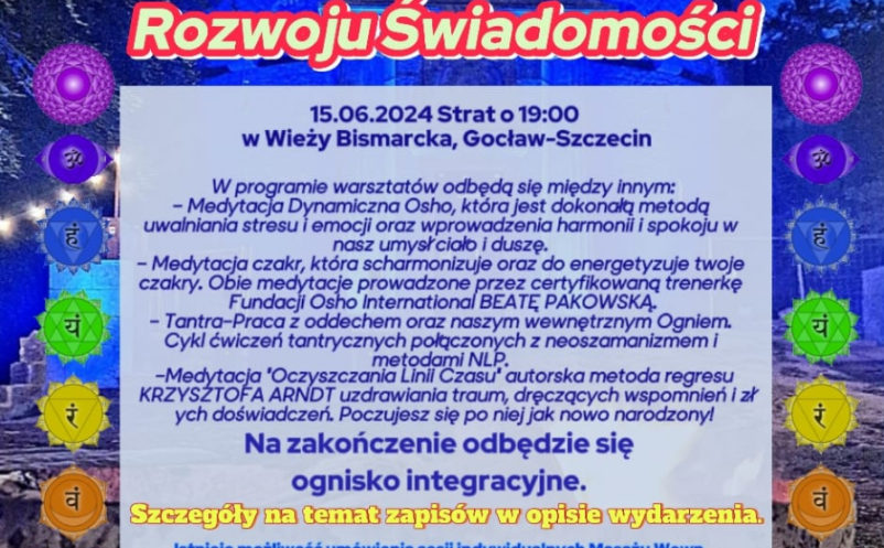 Zapraszamy na wyjątkowe warsztaty, które odbędą się na wieży Bismarcka 15.06.2024 roku o godzinie 18:00! Odkryj Medytację Dynamiczną OSHO – doskonałą metodę uwalniania stresu i emocji, która wprowadzi harmonię i spokój do Twojego umysłu, ciała i duszy. Harmonizuj i doenergetyzuj swoje czakry podczas Medytacji czakr. Pracuj z oddechem oraz wewnętrznym Ogniem. Poczuj się jak nowo narodzony dzięki Medytacji „Oczyszczenia Linii Czasu”.