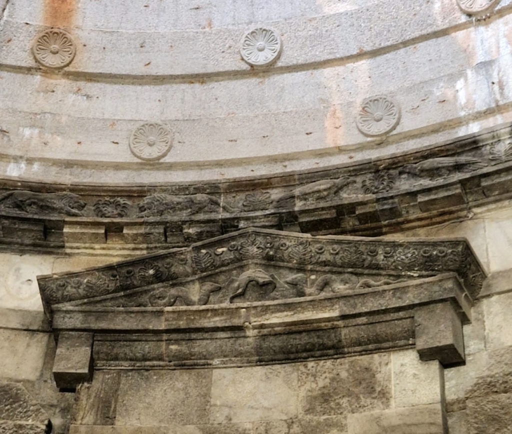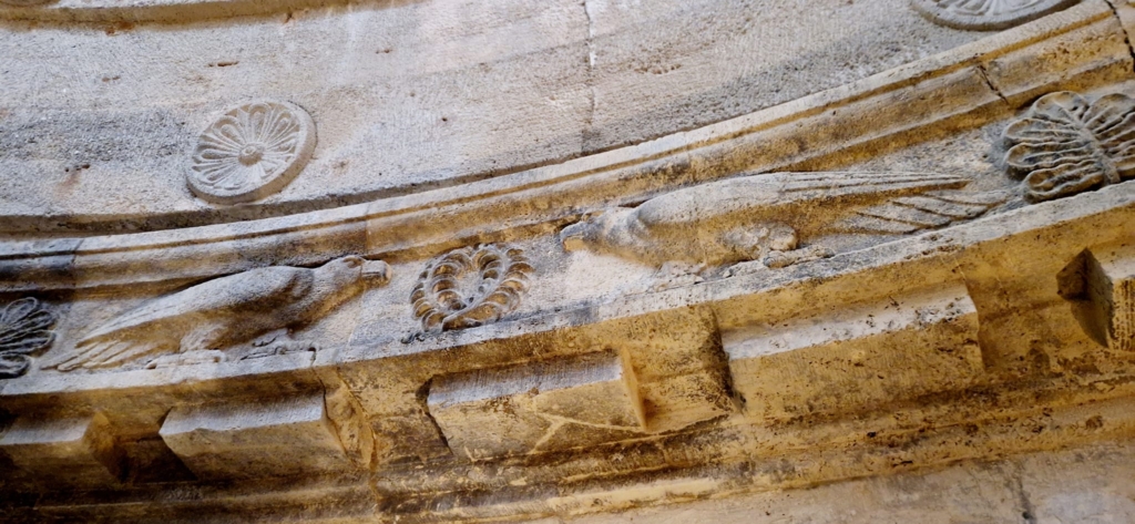 Nad salą na całej długości gzymsu, na przemian zwrócone ku sobie orły na przemian z lwami.